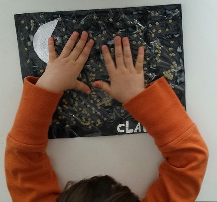 En segundo lugar recortas del papel de plata una luna y tu nombre luego lo pegas en la cartulina.